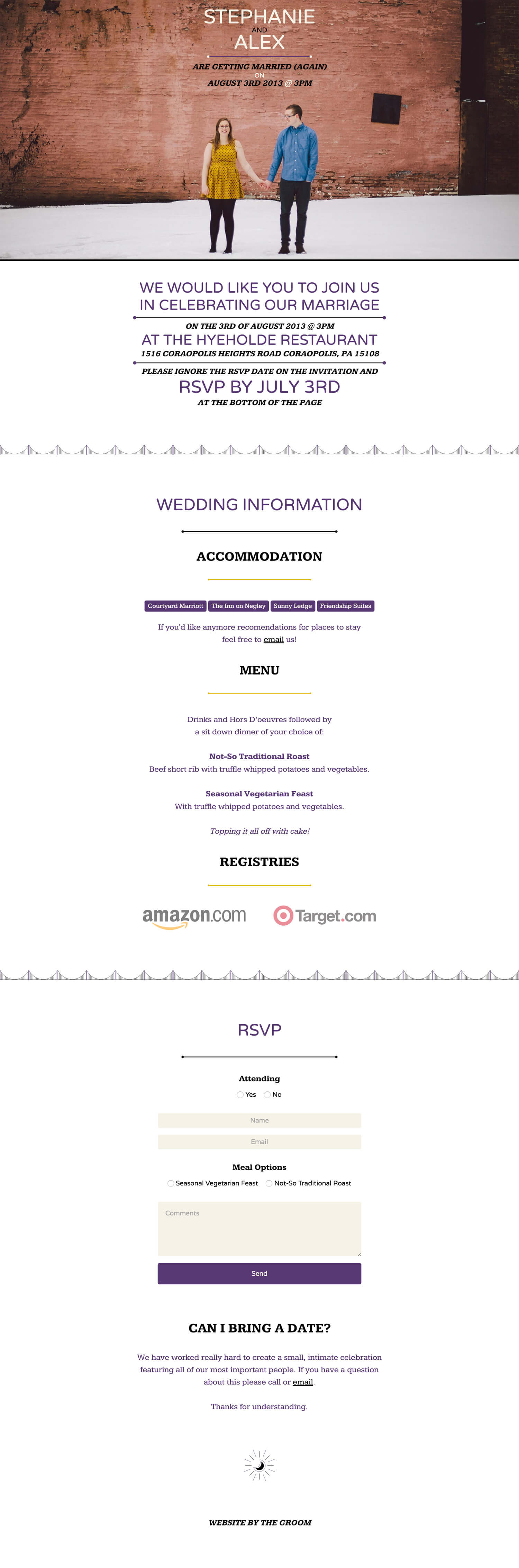 I designed and built my wedding website with the idea that it would be super simple and functuonal for any and everyone who needed to RSVP.